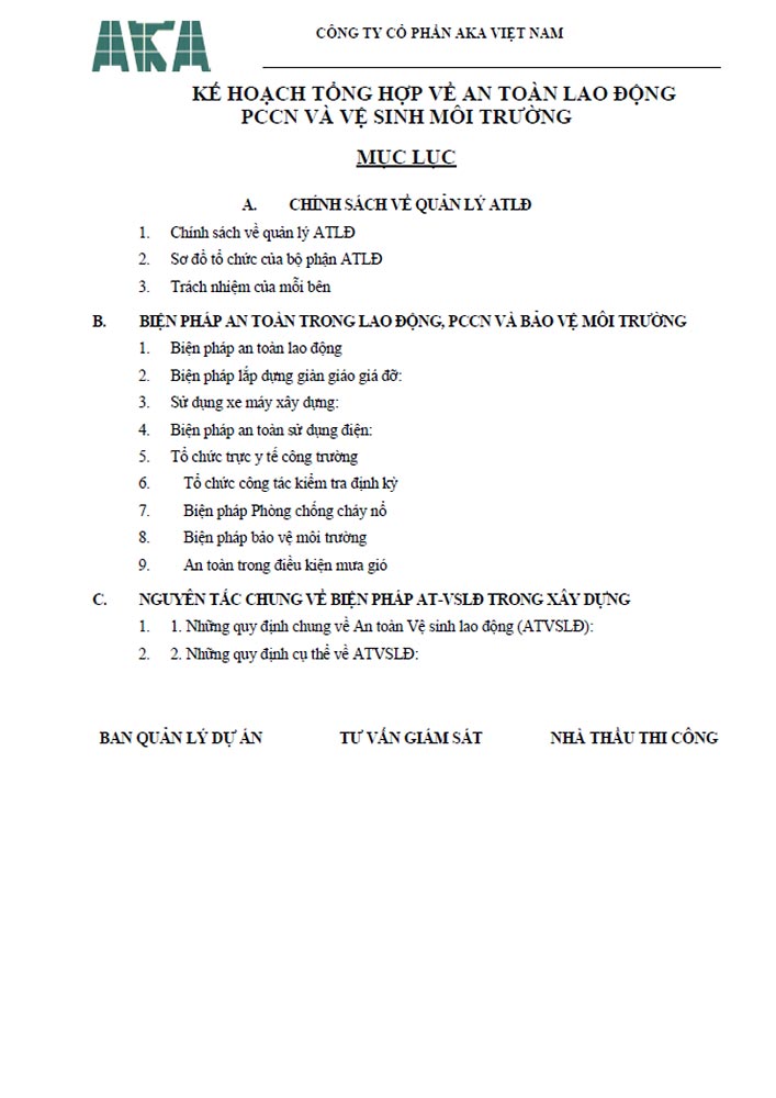 Kế hoạch tổng hợp về an toàn lao động PCCN và vệ sinh môi trường